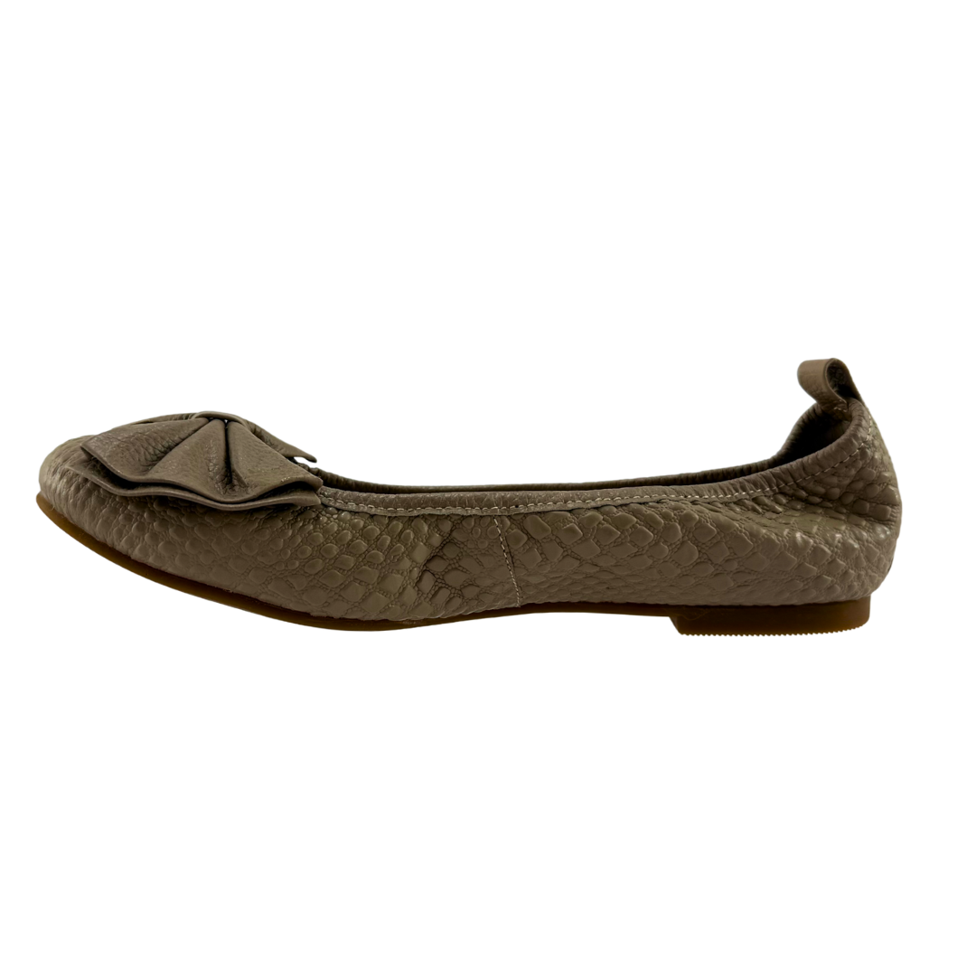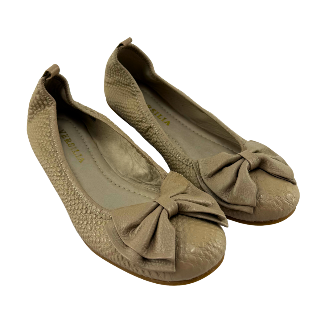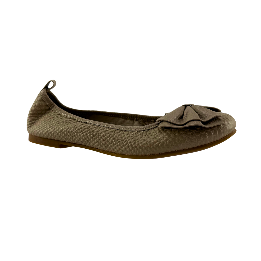 Baleta Mujer Versilia Paulina elaborada en cuero grabado y moño grande decorativo. Ref. 0007070 Disponible en color Arena.