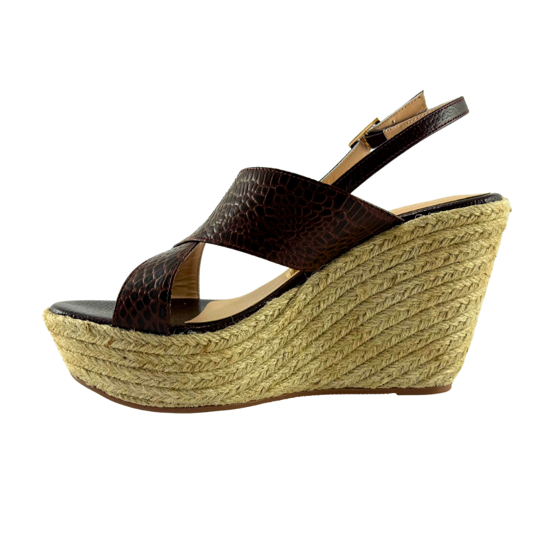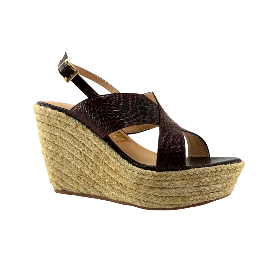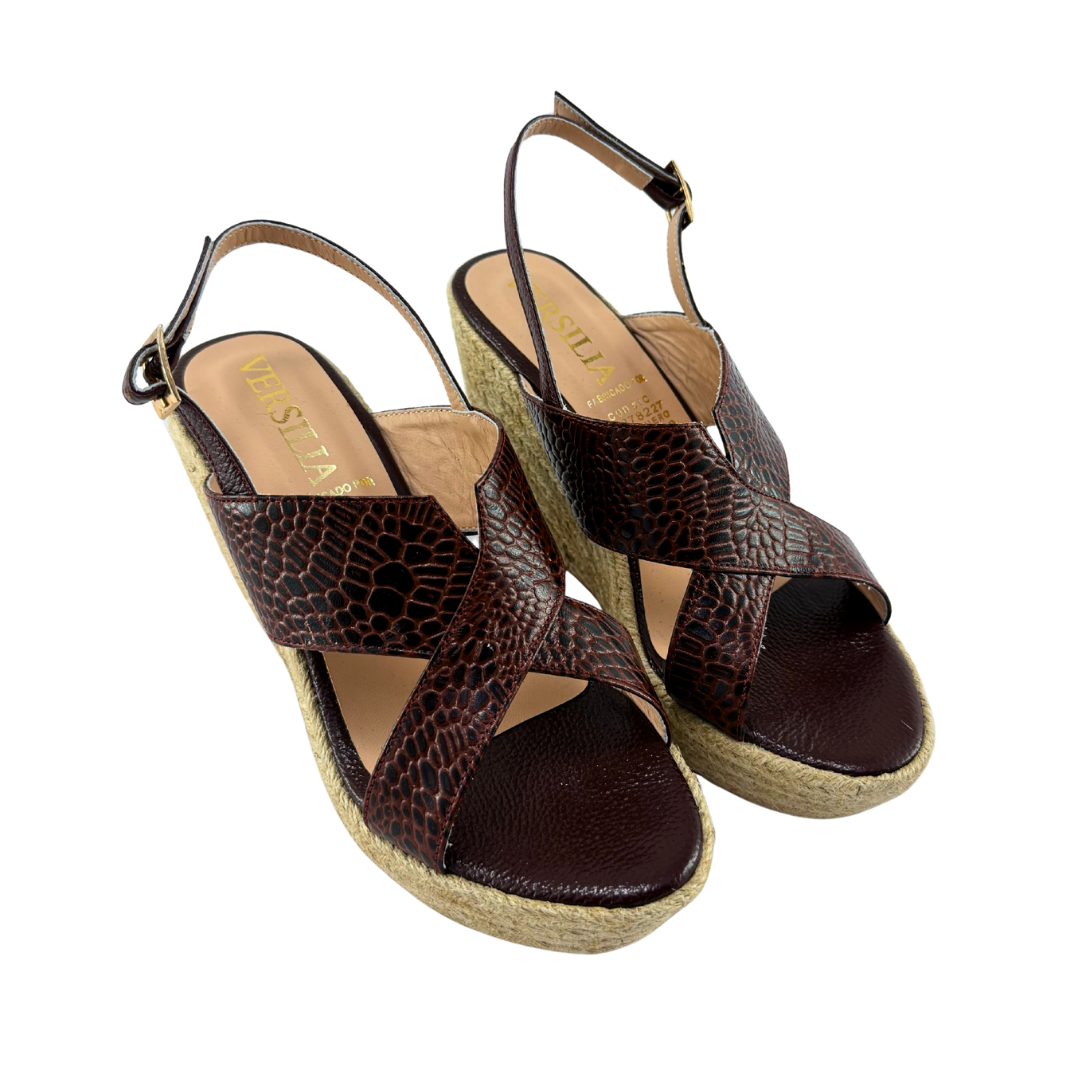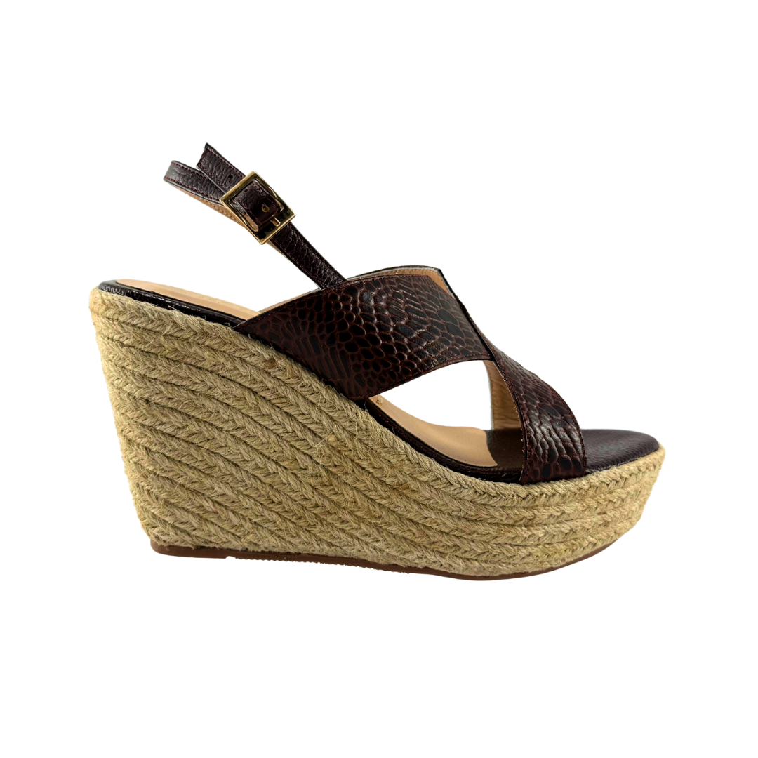 Plataforma Alta Mujer Versilia Manloa elaborado en cuero grabado, capellada ancha cruzada, correa talonera ajustable y plataforma de yute. Ref. 0007079 Disponible en color Cafe.