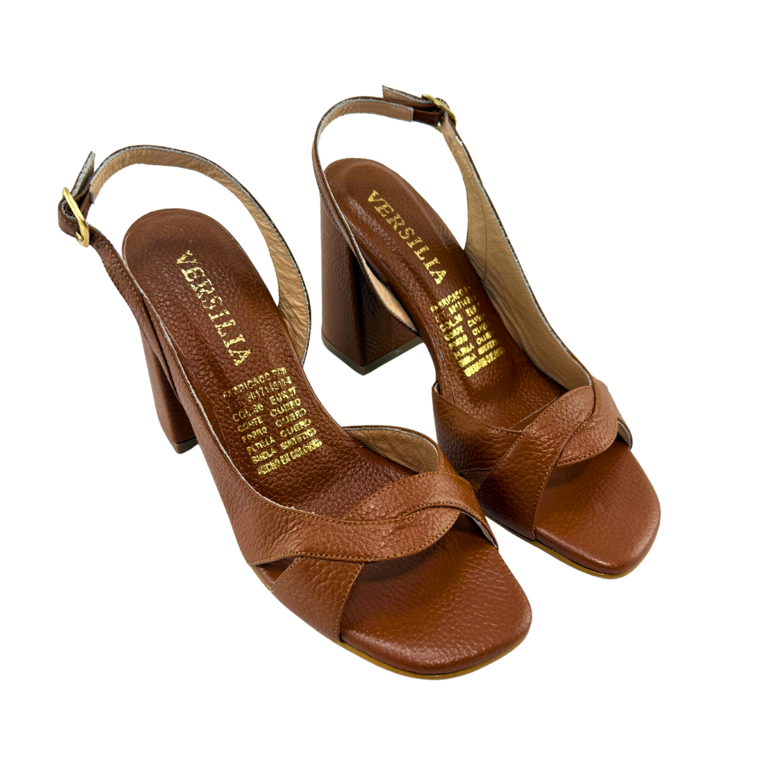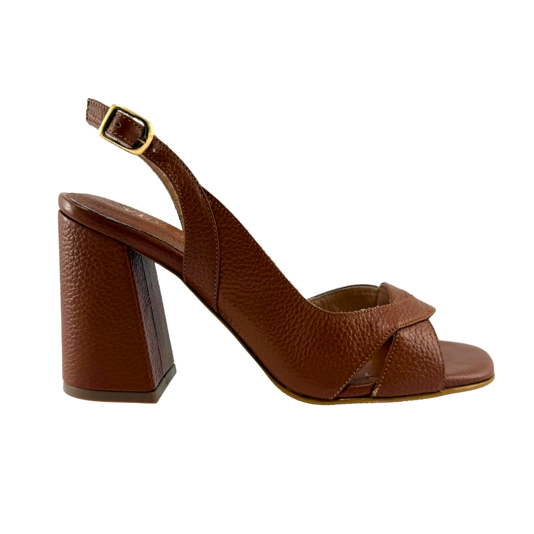 Tacón Alto Mujer Versilia Elara elaborado en cuero capellada de tiras cruzadas y corra ajustable. Ref. 0007134 Disponible en color Miel.