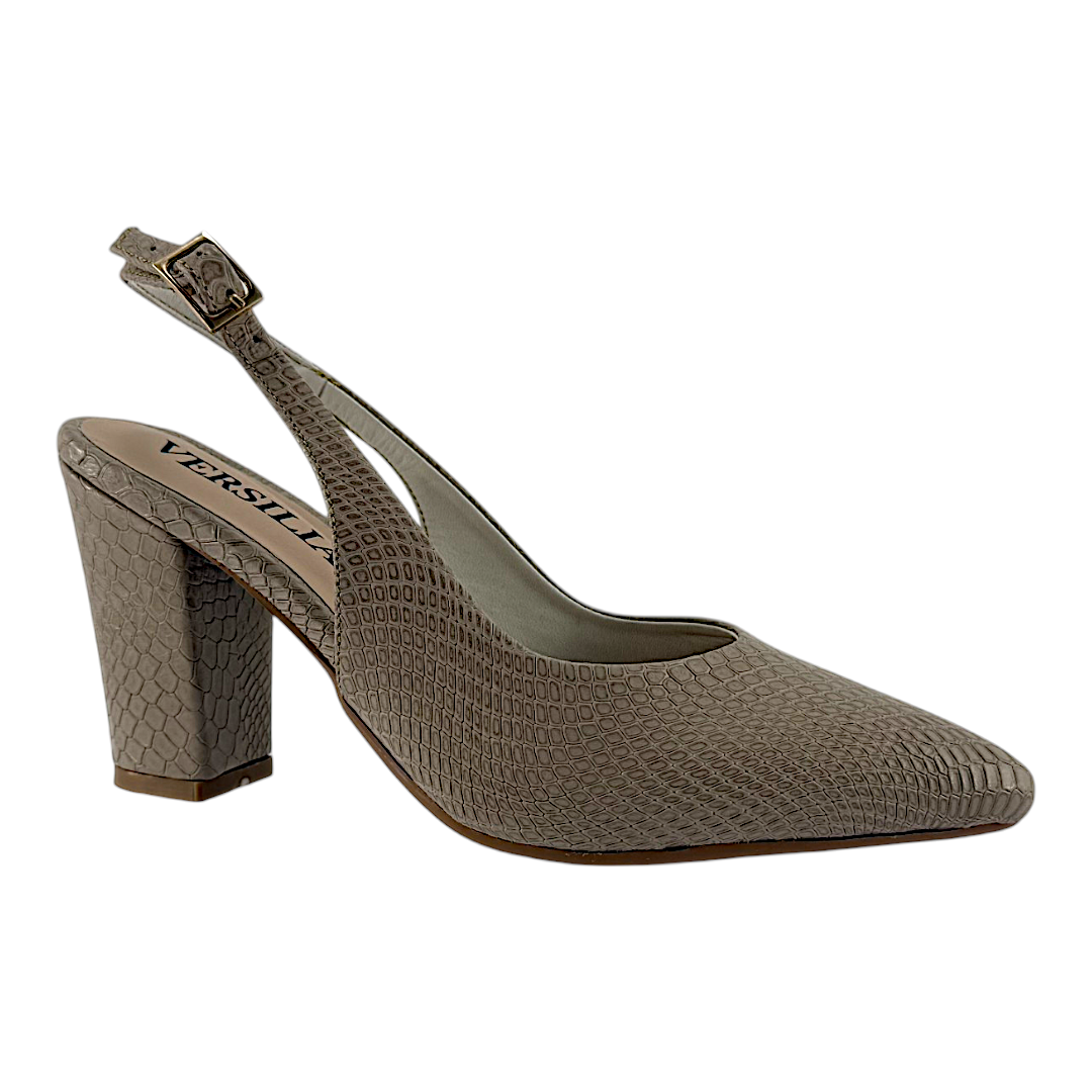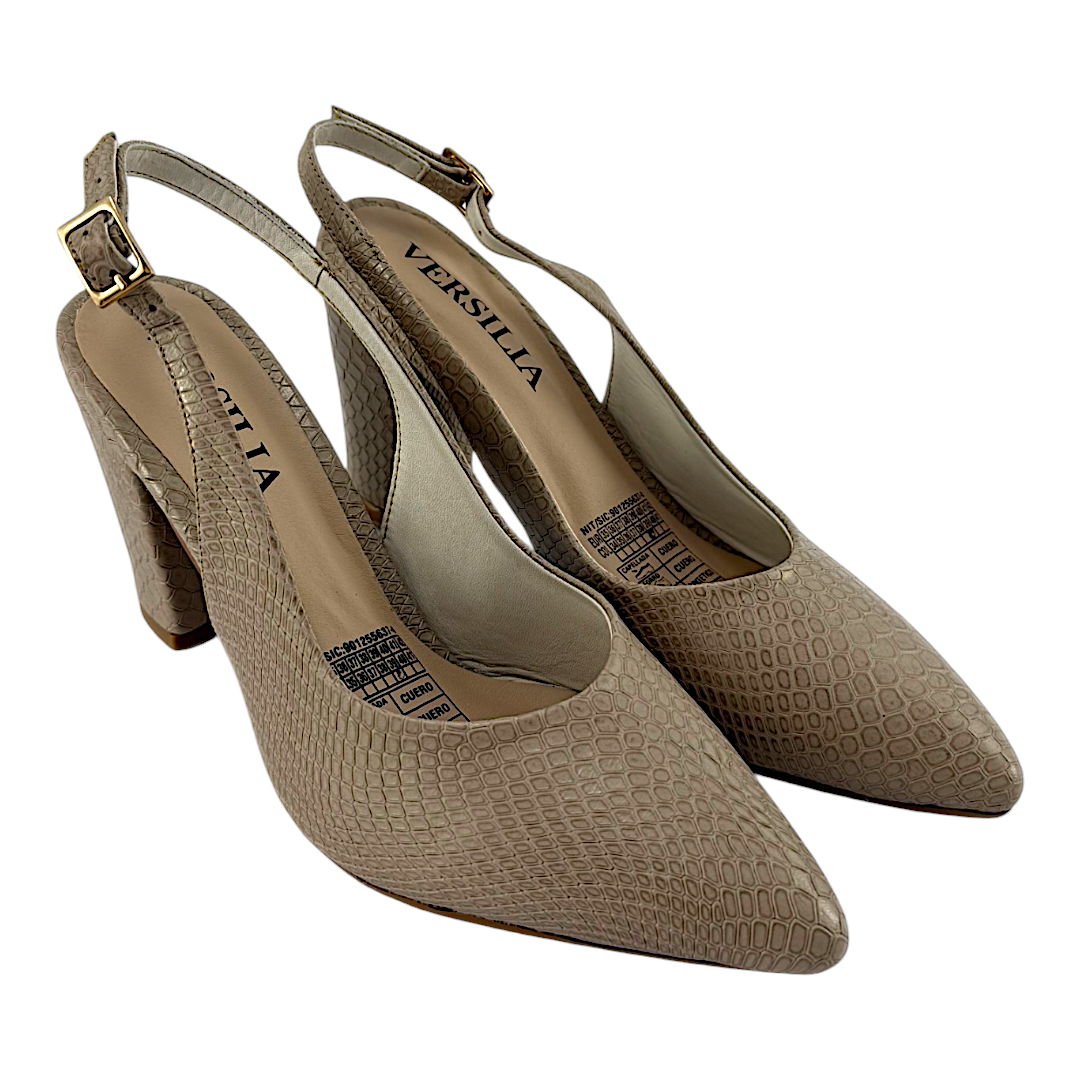 Tacón Alto Mujer Versilia Swing elaborado en cuero grabado con estilo de escamas, de un solo corte cerrado con terminación en punta, destalonado con correa ajustable. 0007589 Disponible en color Arena.