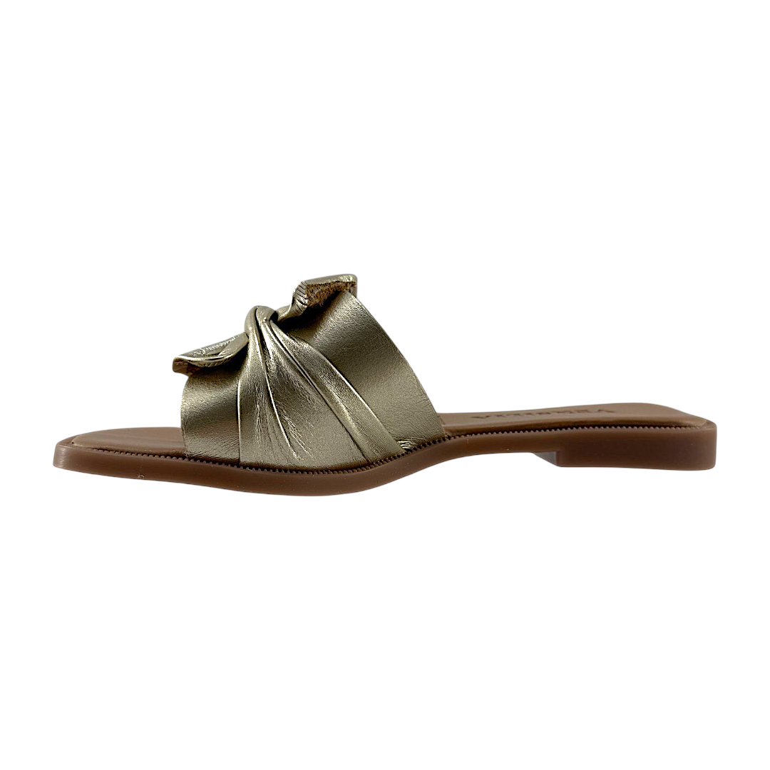 Sandalia Mujer Versilia Plana Brigith elaborado en cuero, capellada con moño decorativo, materiales de alta calidad. Ref. 0007121. Disponible en color Dorado.