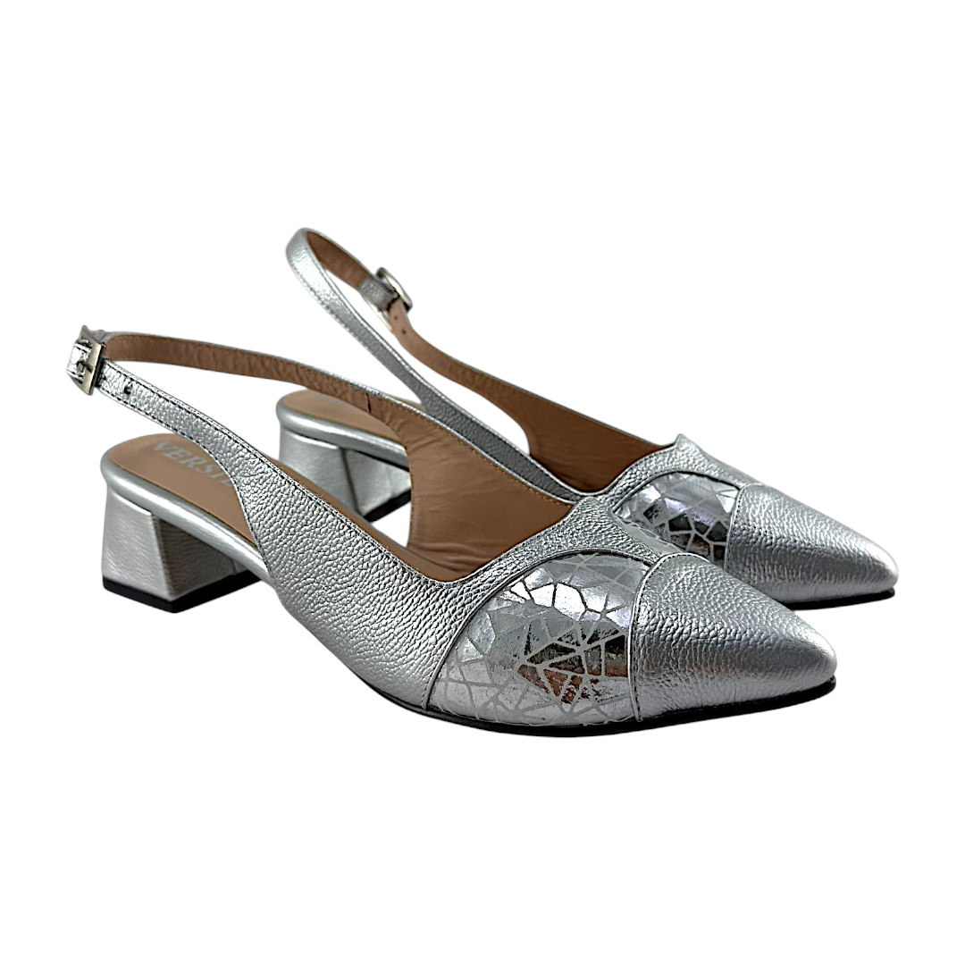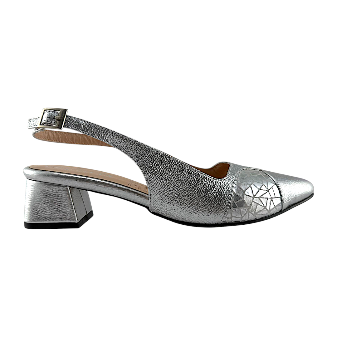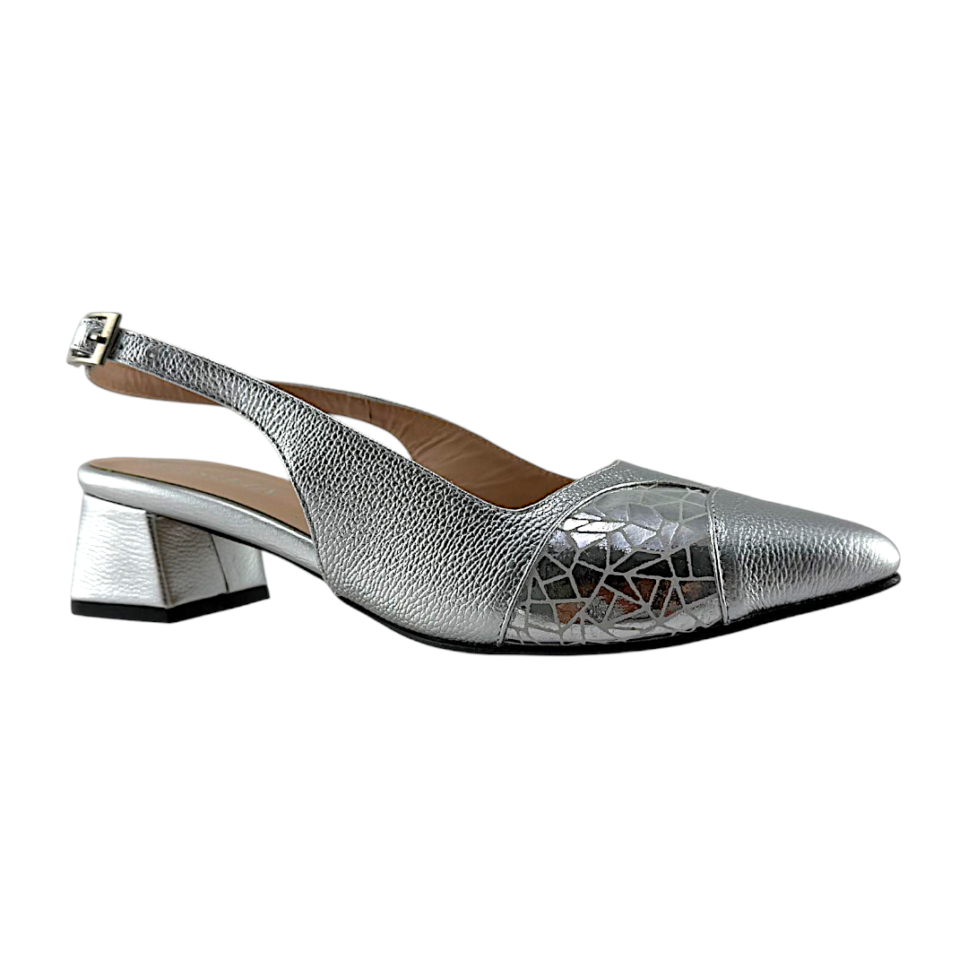 Tacón Sandalia Mujer Versilia Marsella elaborado en cuero, con materiales de alta calidad y correa talonera. Ref. 0007109. Disponible en color Plateado.