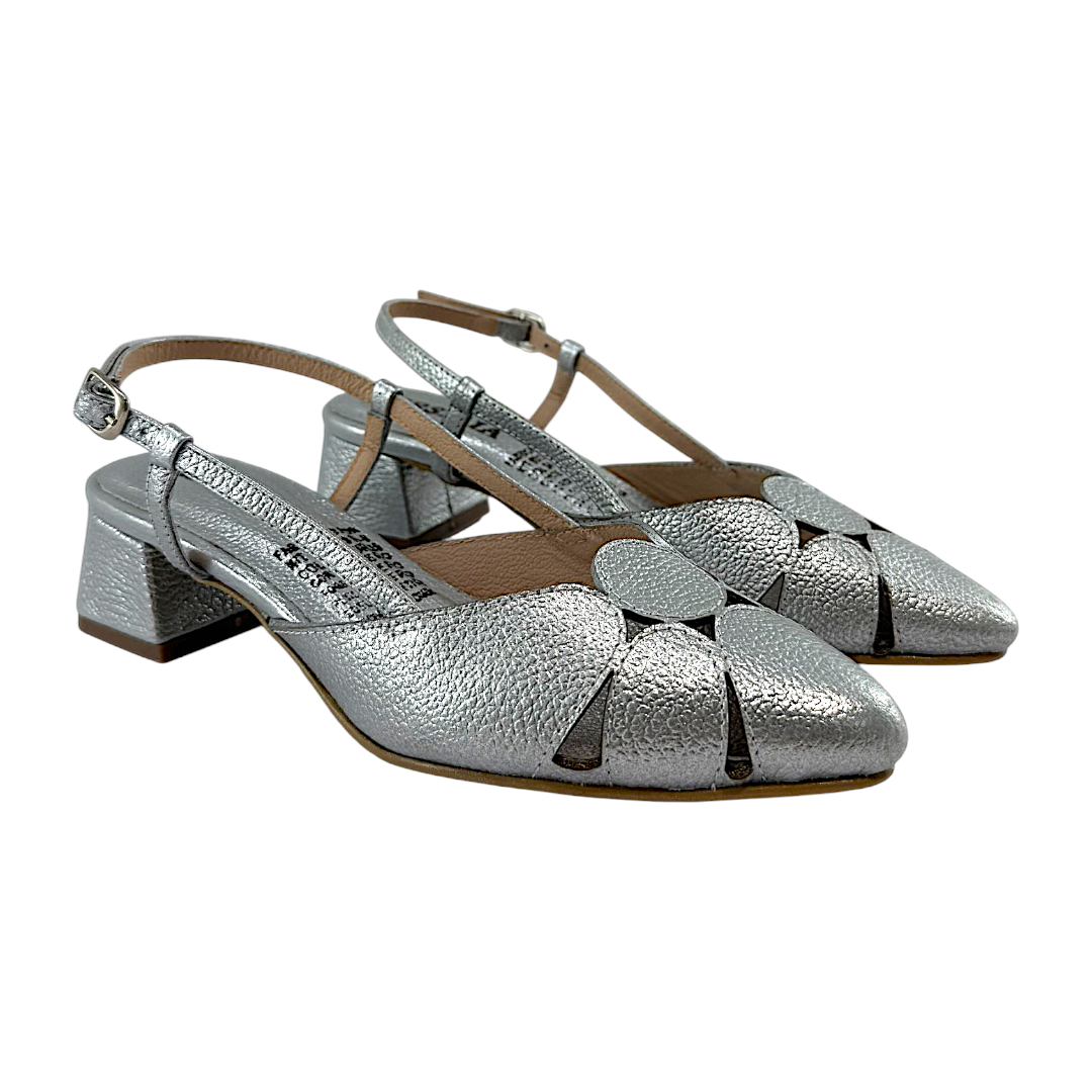 Tacón Mediano Mujer Versilia Petunia elaborado en cuero y correa talonera ajustable. Ref. 0007411 Disponible en color Plateado.